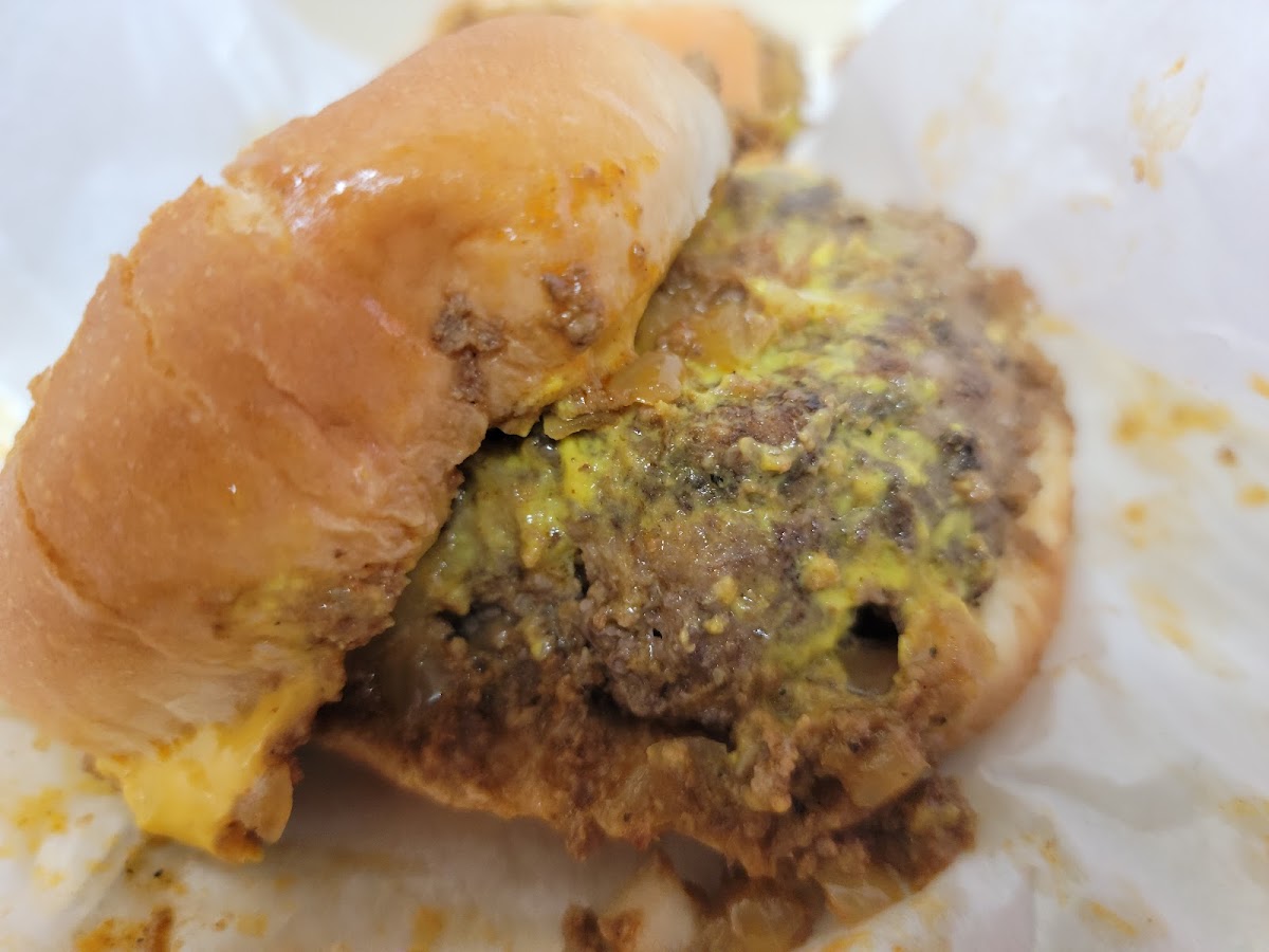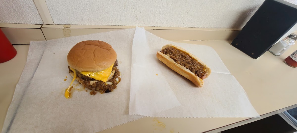 Good greasy burger, all the way and you can't go wrong. The chili is yummy . The hotdogs are good as well. Usually always a line so be warned , but they move the line fast. It's small, little hole in the wall basically. If you want a quick, good burger definitely go here. It's a order and go place so no place to sit. There are standing tables on the sidewalk where people stand up and eat sometimes and a bench there. They only take cash , there is a atm up at the top of the corner. So if you didn't bring cash with ya, there is one right there.